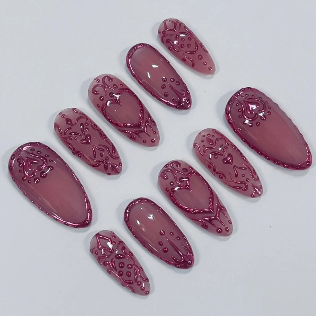 Embrace the elegance of passion with Velvet Romance, a sophisticated press-on nail set inspired by the beauty of love and intricate artistry. Featuring deep wine-colored 3D designs of hearts, ornamental lace patterns, and delicate droplets, this set exudes timeless romance and charm. Its glossy finish enhances the rich color, creating a captivating allure.
