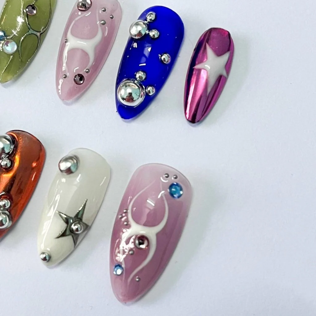 Step into a world of high-fashion chemistry with Chrome Molecule, a dazzling press-on nail set inspired by molecular structures and avant-garde aesthetics. Featuring radiant chrome finishes in fiery copper, sleek silver, and electric blue, each nail showcases bold spheres, metallic stars, and sculpted curves that blend art and science into a captivating masterpiece.