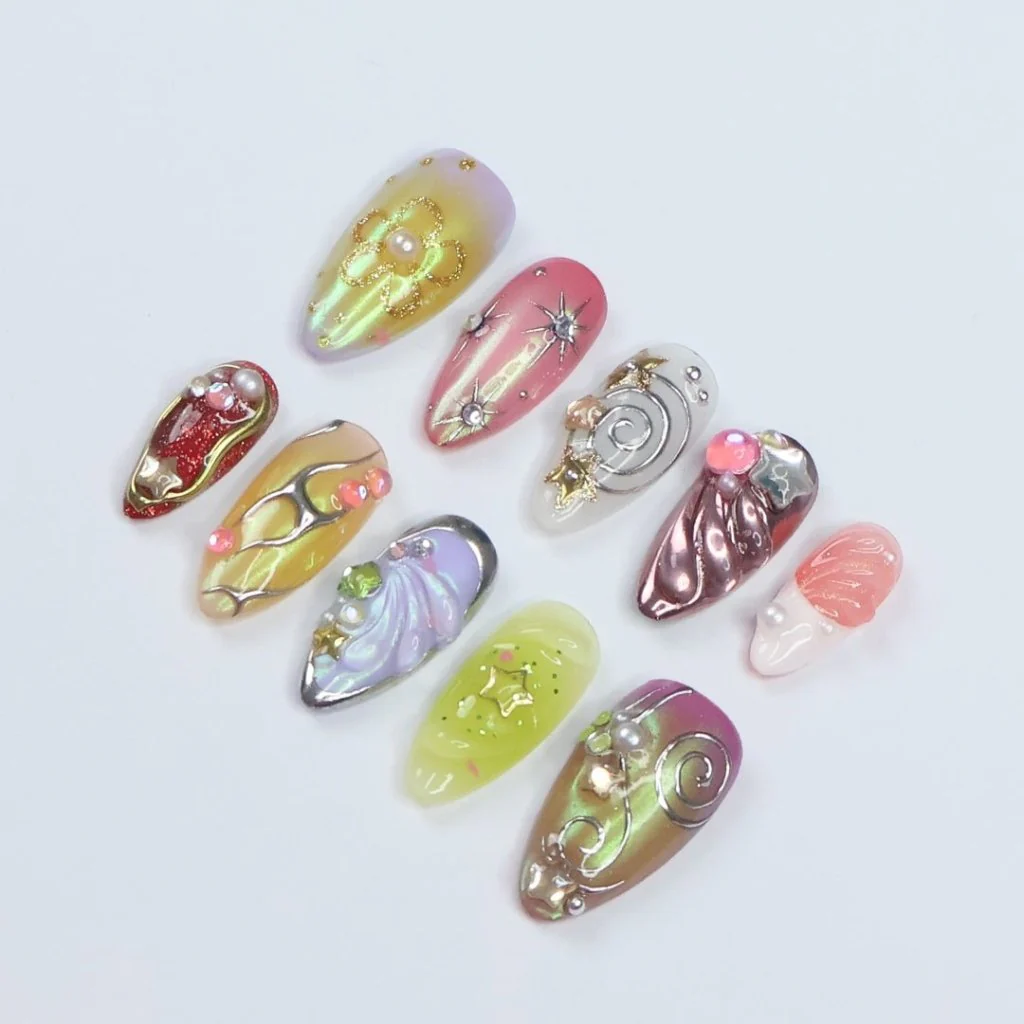 A fairytale at your fingertips. Soft iridescent hues, golden swirls, and pearl-like accents come together in a dreamy, celestial mix. Every nail tells a story—shimmering stars, delicate florals, and ethereal textures that feel straight out of a fantasy world. If you love whimsical, magical, and one-of-a-kind nails, this set was made for you. ✨