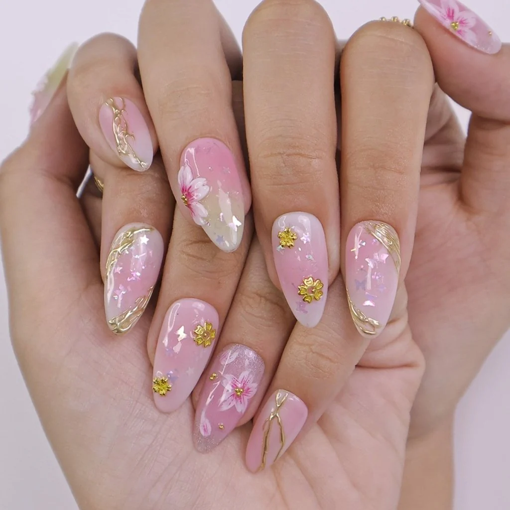 Unveil your delicate side with Fleurveil, a gorgeous press-on nail set that harmonizes intricate flowers, glossy gold vines, and sparkling pastel glitters. This dreamy design exudes luxury and timeless beauty.