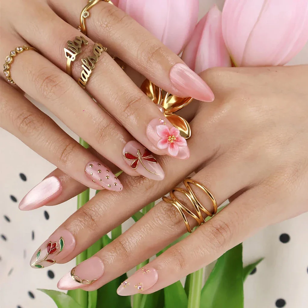 There's a quiet luxury to this nail design that's hard to put into words — you just feel it the moment it's on. The warm blush base, the way the light moves across each nail, the gold that frames every detail like it belongs in a gallery. A dragonfly mid-flight. Tulips in deep red. A bloom so soft it barely looks real.