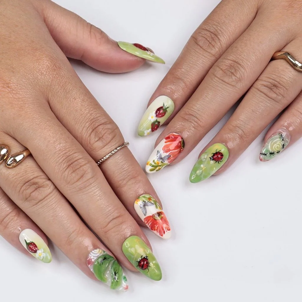 Step into a miniature world of enchantment with Meadowverse, a press-on nail set inspired by the magic of meadows teeming with life. The name blends "Meadow", symbolizing lush greenery and blooming flora, with "Verse", evoking an entire universe of nature’s tiny wonders. Hand-painted strawberries, ladybugs, butterflies, and crawling ants bring a whimsical charm, while soft green hues and delicate floral accents create an ethereal, storybook-like aesthetic.
