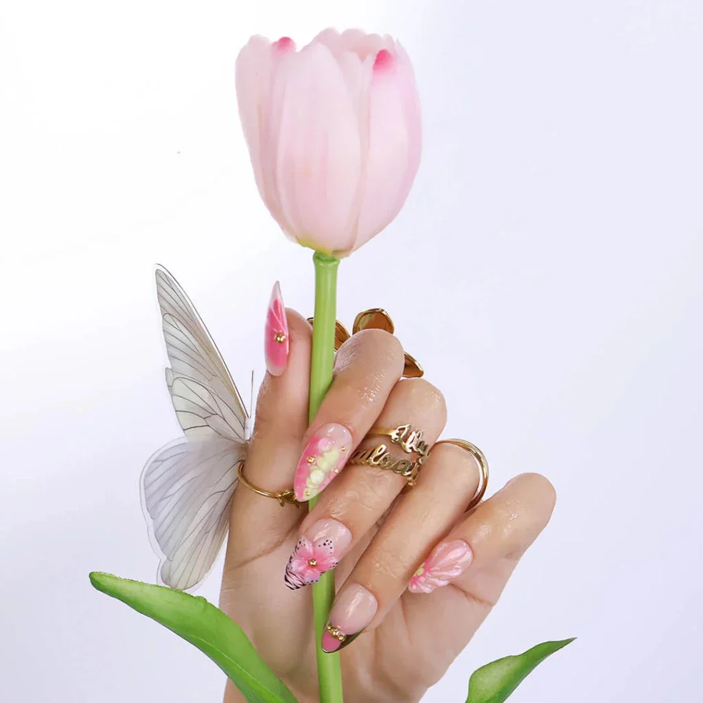 The blooms are the star. Layered petals in the most gorgeous shades of pink, the kind that look like they're still opening, still breathing. There's a wildness to orchids that feels romantic — untamed but graceful, vivid but soft. Every nail carries that same energy. Like spring just exhaled, and this is what came out.