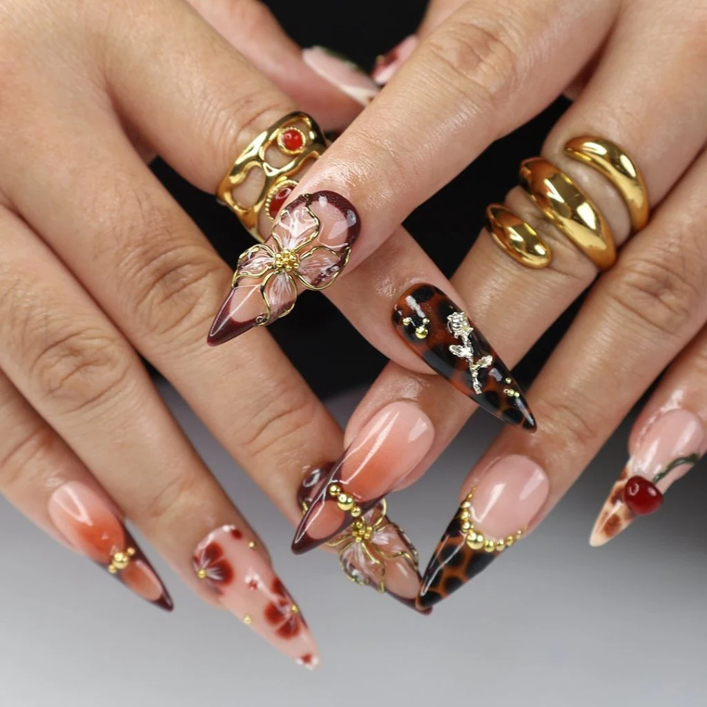 Indulge in elegance with the Scarlet Reverie Handmade Press-On Nails. This stunning set features rich nude and deep brown tones, accented with delicate 3D florals, gold embellishments, and charming cherry designs. Perfect for special occasions, holidays, or simply when you want to feel effortlessly chic and confident.