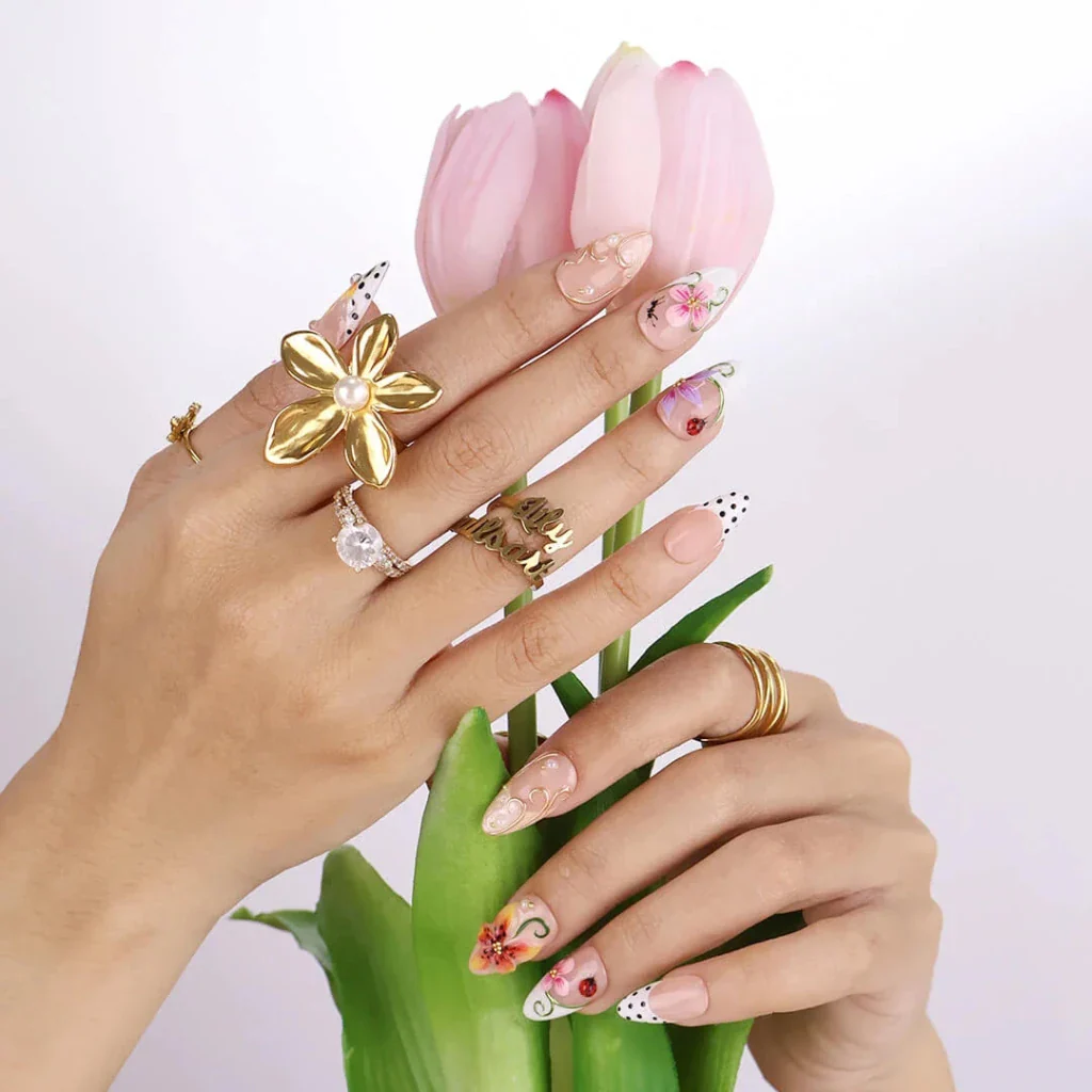 A warm nude base that feels like second skin — then it gets interesting. Wildflowers hand-painted in purple, blush pink and golden yellow like someone literally picked them from a garden and placed them on your fingertips. Vines that curl. A ladybug that only the people closest to you will spot. Polka dot tips that are playful without being loud. Gold swirls that shimmer every time you reach for your coffee, your glass, anything — and someone across the table notices.