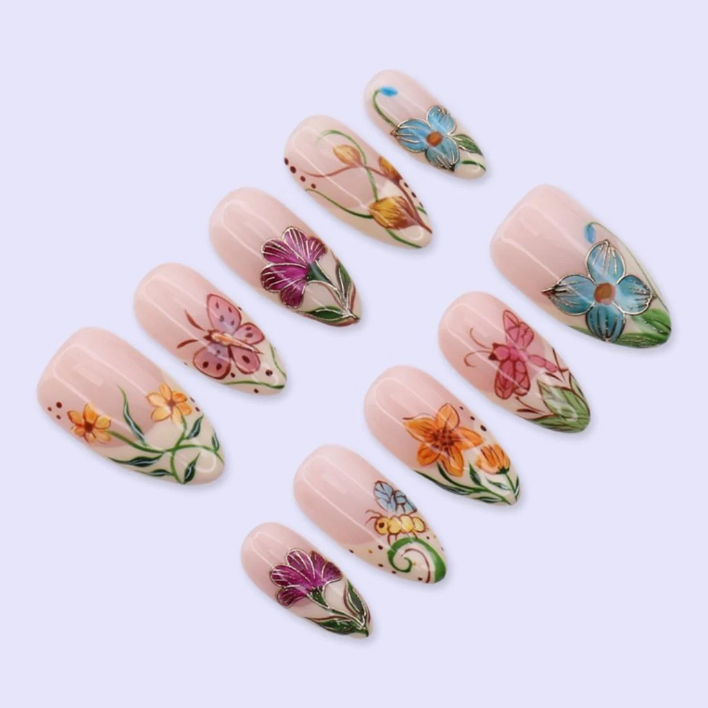 Like spring was painted right onto your nails, one brushstroke at a time. This set captures the wild beauty of a countryside meadow in full bloom — bold wildflowers in orange, magenta & blue, delicate butterflies dancing between stems, and golden outlines that catch the light with every move. A wearable masterpiece for the girl who loves colour and isn't afraid to let her nails do the talking.